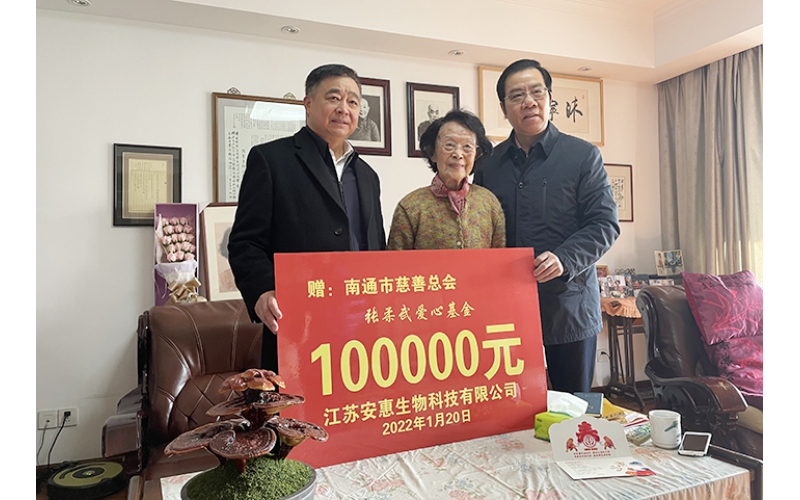 2022年1月20日,安惠公司董事長陳惠、南通市慈善總會副會長葉沈良來到張柔武老人家中,通過安惠健康公益基金向張柔武愛心基金捐贈10萬元,助力“情暖江?!贝汗?jié)慰問活動。